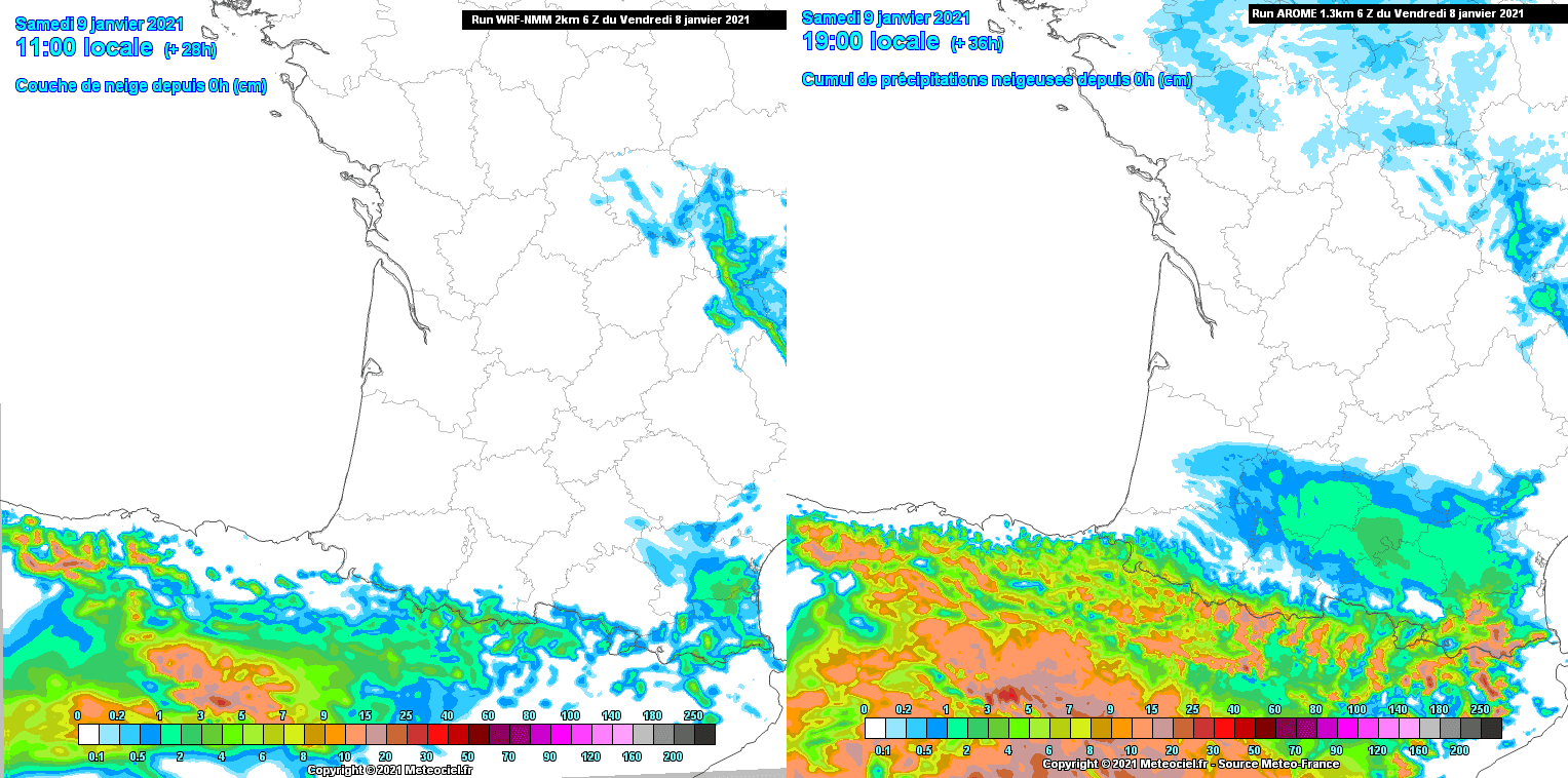 Comparaison des accumulations de précipitations neigeuses du modèle WRF-2km (gauche) et du modèle Arome (droite) pour le samedi 9 janvier – via météociel.fr