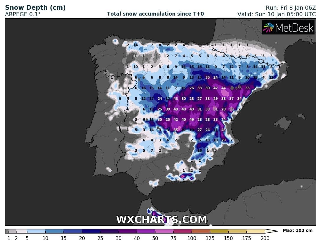 Accumulation de neige envisagée jusqu’au dimanche 10 janvier sur l’Espagne – Modèle Arpège via WX CHARTS