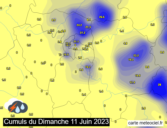 Cumuls de précipitations en Île-de-France le dimanche 11 juin 2023 - via meteociel.fr