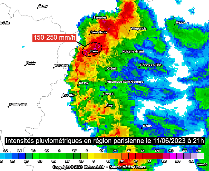Si les stations n'ont généralement pas enregistré plus de 20 à 30 mm dans les zones les plus touchées par l'orage du 11 juin au soir, ce sont bel et bien les intensités qui ont conduit à des ruissellements et des inondations. Dans le nord-est de Paris (zone la plus touchée de la capitale), ces 20 à 30 mm sont tombés en l'espace d'un quart d'heure seulement ! Au plus fort de l'orage, les echos radar ont temporairement mesuré des intensités de 150 à 250 mm/h ! Cela représente de grandes quantités d'eau s'abattant en seulement quelques minutes...