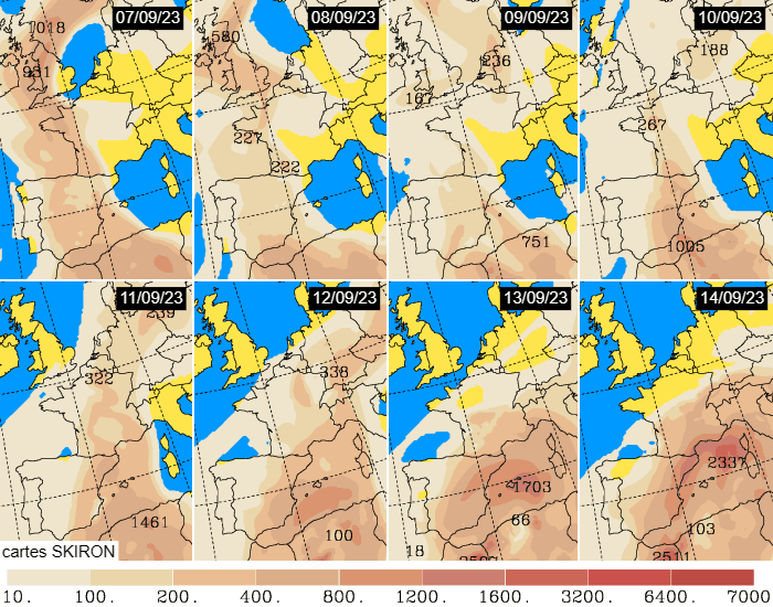 Concentrations en sable dans l'atmosphère entre le jeudi 7 et le jeudi 14 septembre 2023 - cartes SKIRON