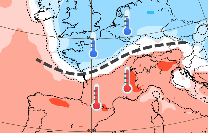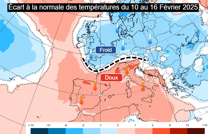 Sans grande surprise, le bilan thermique de cette semaine du lundi 10 au dimanche 16 février 2025 s'annonce très contrasté. Le thermomètre devrait afficher un déficit par rapport aux normales saisonnières de la Bretagne à la Belgique, de l'ordre de -1 à -3°C sur 7 jours. À l'inverse, l'ensemble de la moitié sud de la France devrait enregistrer un excédent thermique de l'ordre de +2 à +3°C en général. En faisant une moyenne nationale, cette semaine devrait donc s'inscrire plus ou moins dans les normales.