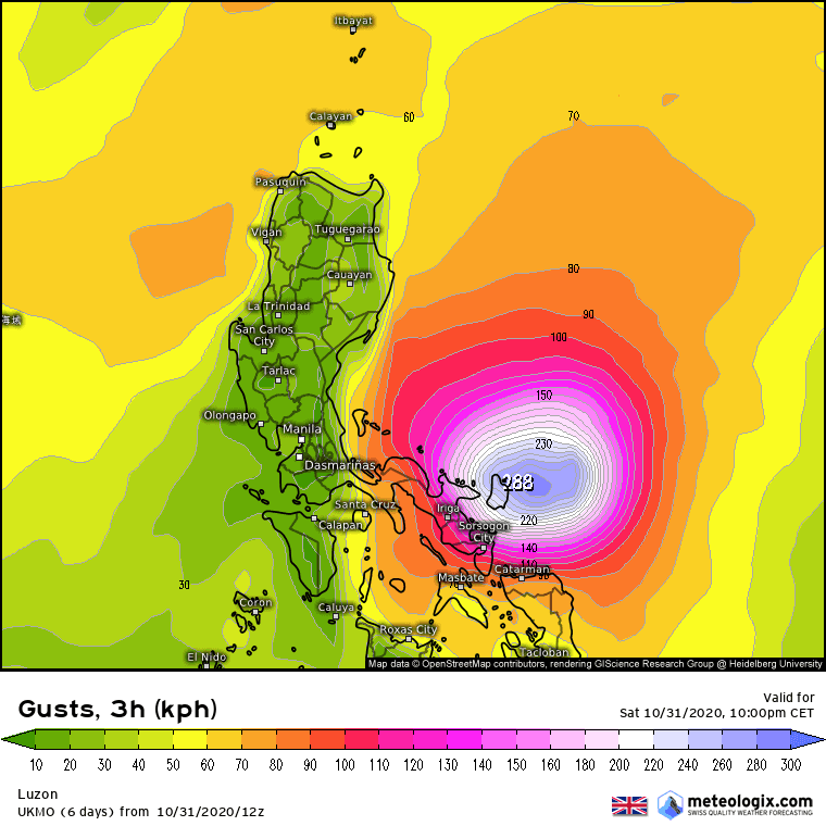 Classé en catégorie 5 (soit la catégorie maximale), ce typhon est, selon les données du Joint Typhoon Warning Center (centre officiel de suivi des ouragans sur le bassin Pacifique) le plus puissant depuis 2016 dans cette zone du globe. Avec une pression atmosphérique incroyable sous les 900hPa en son centre, et avec des rafales en pointe approchant les 350km/h (!!), c'est un véritable monstre qui s'apprête à frapper l'archipel Philippin. Selon les dernières prévisions de trajectoire, la capitale Manille et son agglomération (11 millions d'habitants) pourraient être frappés de plein fouet !