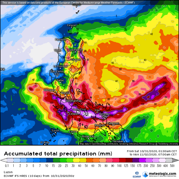 Accumulation des pluies sur 48h aux Philippines - 31 octobre et 1er novembre 2020 - Modèle ECMWF via Meteologix