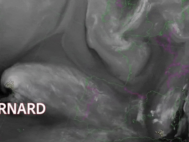 Si la pression s'est abaissée à des niveaux inhabituellement bas pour cette région, c'est parce que la dépression Bernard n'était pas une tempête comme les autres. Ce système s'est formé en présence d'une masse d'air d'origine subtropicale avec de l'air chaud au coeur de la dépression. Cela a favorisé une convection au sein du système avec la formation de paquets pluvio-orageux, sous lesquels de puissantes rafales de vent étaient observées. Cette caractéristique est commune aux cyclones tropicaux, toute proportion gardée. D'ailleurs, l'animation satellite ci-dessous montre très bien la convection : on observe une sorte de bouillonnement nuageux apparaissant en blanc au sein de la tempête.