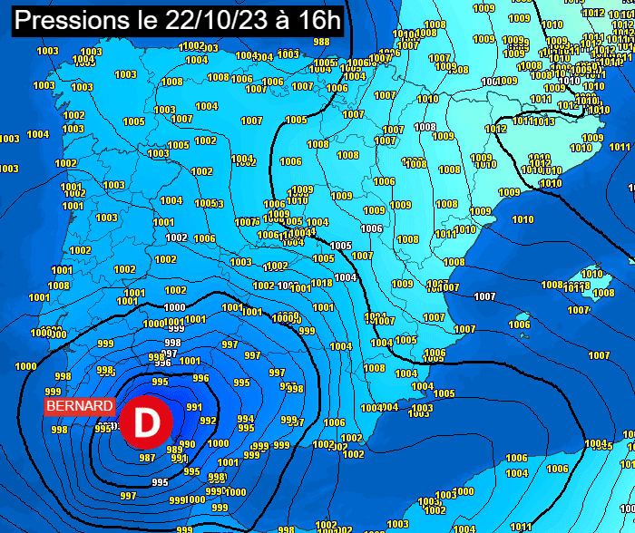 La tempête Bernard - qui a touché le sud de l'Espagne ce dimanche 22 octobre 2023 - s'est montrée particulièrement vigoureuse. La carte des pressions mesurées en après-midi de dimanche suffit à comprendre pourquoi le phénomène fut intense. Au centre de Bernard, les baromètres ont chuté sous la barre des 990 hPa dans le sud-ouest de l'Espagne. De tels niveaux constituent un record en octobre dans cette région depuis au moins 1950, preuve du caractère atypique de cette tempête !