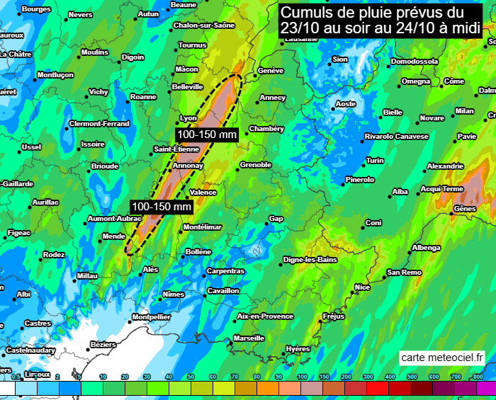 Dans la nuit de lundi à mardi, un axe pluvio-orageux actif va se mettre en place de l'est des Cévennes jusqu'au Jura où il va stationner durablement jusqu'en début de journée du mardi 24 octobre 2023. Les cumuls les plus importants sont modélisés sur l'ouest et le nord de l'Ardèche, le nord de l'Isère et l'est de l'Ain où des accumulations de 100 à 150 mm sont envisagées, localement un peu plus en Ardèche. De telles quantités d'eau sont susceptibles de générer ruissellements et inondations avec un risque de crue notable sur les cours d'eau ardéchois. Par ailleurs, des cumuls de 30 à 60 mm sont prévus entre l'est du Var et les Alpes-Maritimes, voire 80 mm sur le relief.