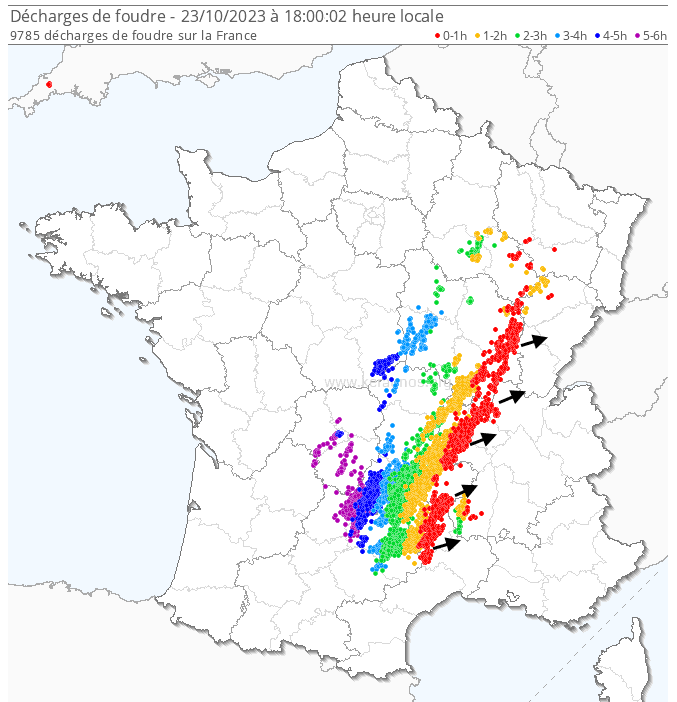 Si la tempête Bernard s'est comblée en circulant au dessus des terres espagnoles, une zone d'instabilité est toujours présente et se manifeste sur le centre et l'est de la France en cette fin de journée du lundi 23 octobre 2023. Un axe pluvio-orageux s'est formé sur le Massif Central en après-midi et migre vers l'est. Il s'étirait des Cévennes jusqu'au val de Saône en début de soirée avec près de 10.000 décharges de foudre détectées en l'espace de 6 heures, un chiffre considérable si tard dans la saison et qui témoigne d'une masse d'air aux origines subtropicales.