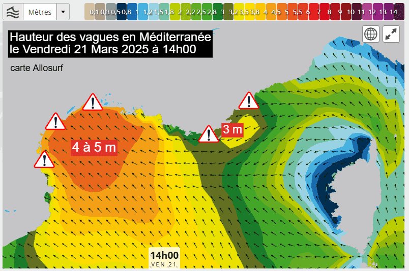 Hauteur des vagues en Méditerranée ce vendredi 21 mars 2025 à 14h - Allosurf