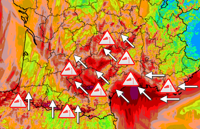 Le vent s'accentue ce jeudi 20 mars 2025 sur tout le sud du Massif Central. On attend des rafales atteignant fréquemment 70 à 90 km/h jusqu'en après-midi du vendredi 21 mars 2025. Dans le domaine de l'autan, on pourra atteindre 100 km/h en région toulousaine et 120 km/h vers la Montagne Noire ! Un puissant vent de sud souffle aussi sur les Pyrénées, pouvant dépasser les 100 km/h sur les crêtes. Enfin, le marin sera violent sur le golfe du Lion ce vendredi avec des rafales de 80 à 100 km/h, s'enfonçant sur la plaine littorale du Languedoc.