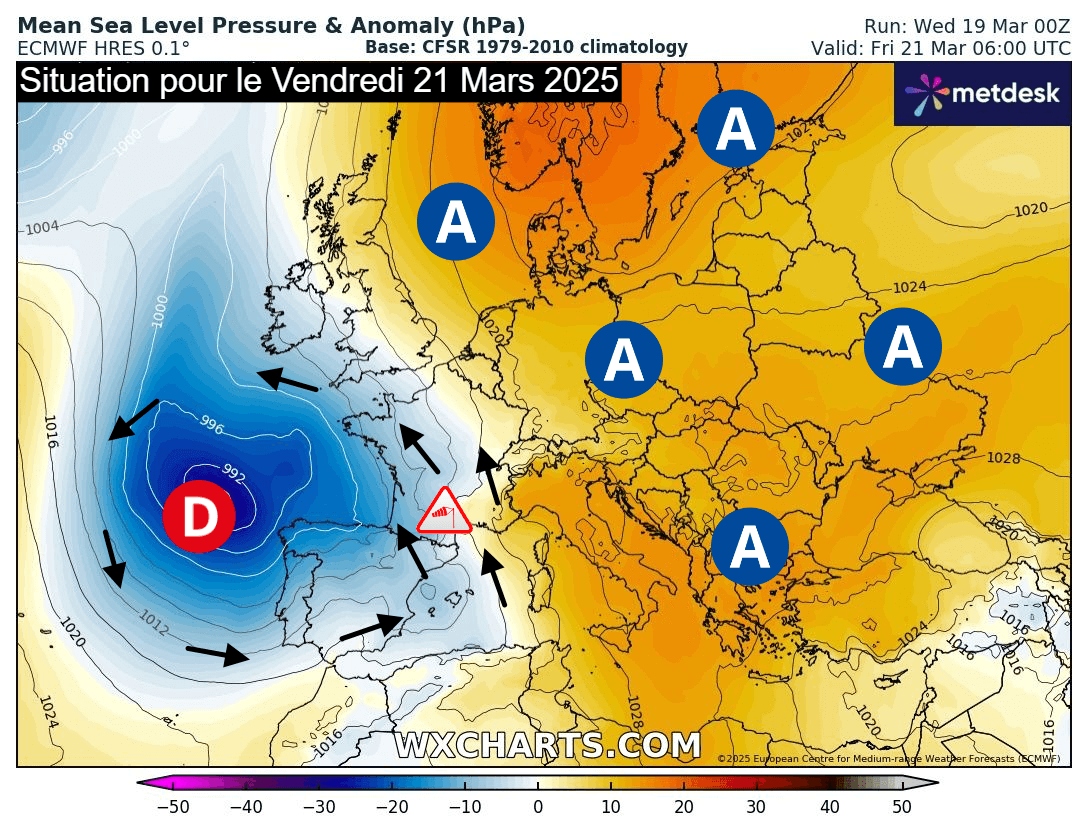 Situation météorologique en Europe ce vendredi 21 mars 2025 avec tempête d'autan - wxcharts.com