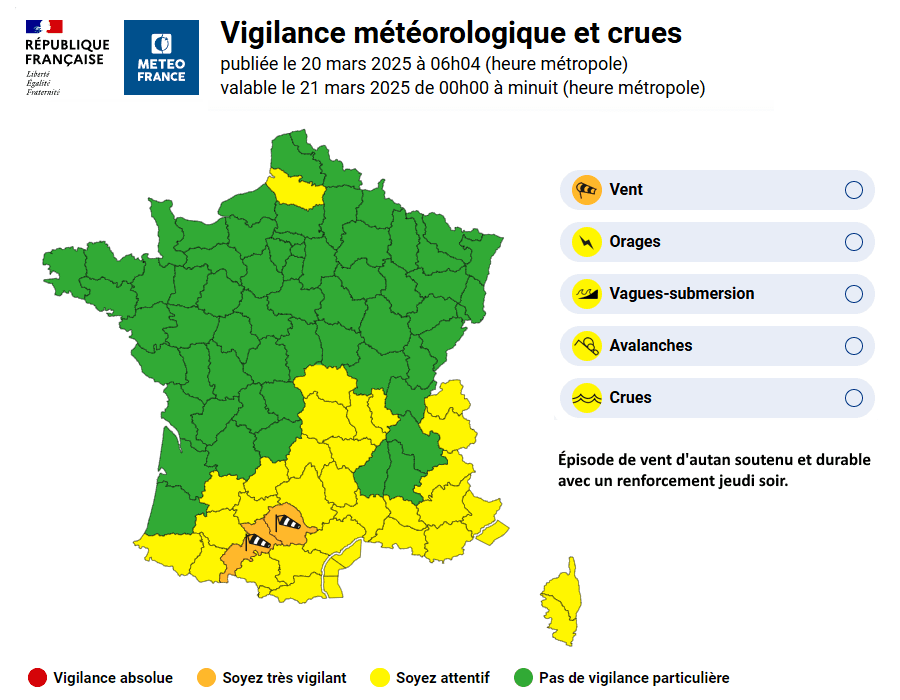 Carte de vigilance valable pour le vendredi 21 mars 2025 - Météo France