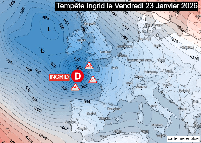 Une dépression tempétueuse se creusera rapidement au dessus des eaux de l'océan Atlantique ce jeudi 22 janvier 2026. Elle apportera du très mauvais temps sur le nord-ouest de la péninsule ibérique, raison pour laquelle les services météo espagnols ont baptisé cette tempête. Elle porte le nom d'Ingrid. Cette dernière atteindra des pressions inférieures à 960 hPa en son centre lorsqu'elle arrivera au large de la Bretagne vendredi 23 janvier 2026. Elle va ensuite se combler progressivement en remontant vers l'Irlande. Comme elle ne progressera pas vers l'est, son impact en France restera limité.
