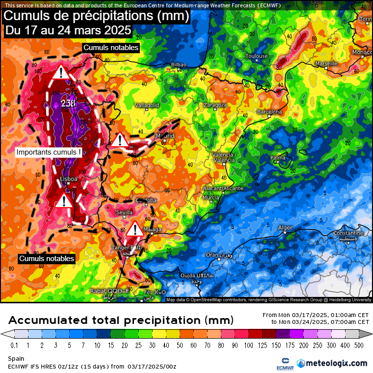 Cumuls de précipitations envisagés d'ici le lundi 24 mars 2025 sur la péninsule ibérique – Modèle ECMWF HRES via meteologix