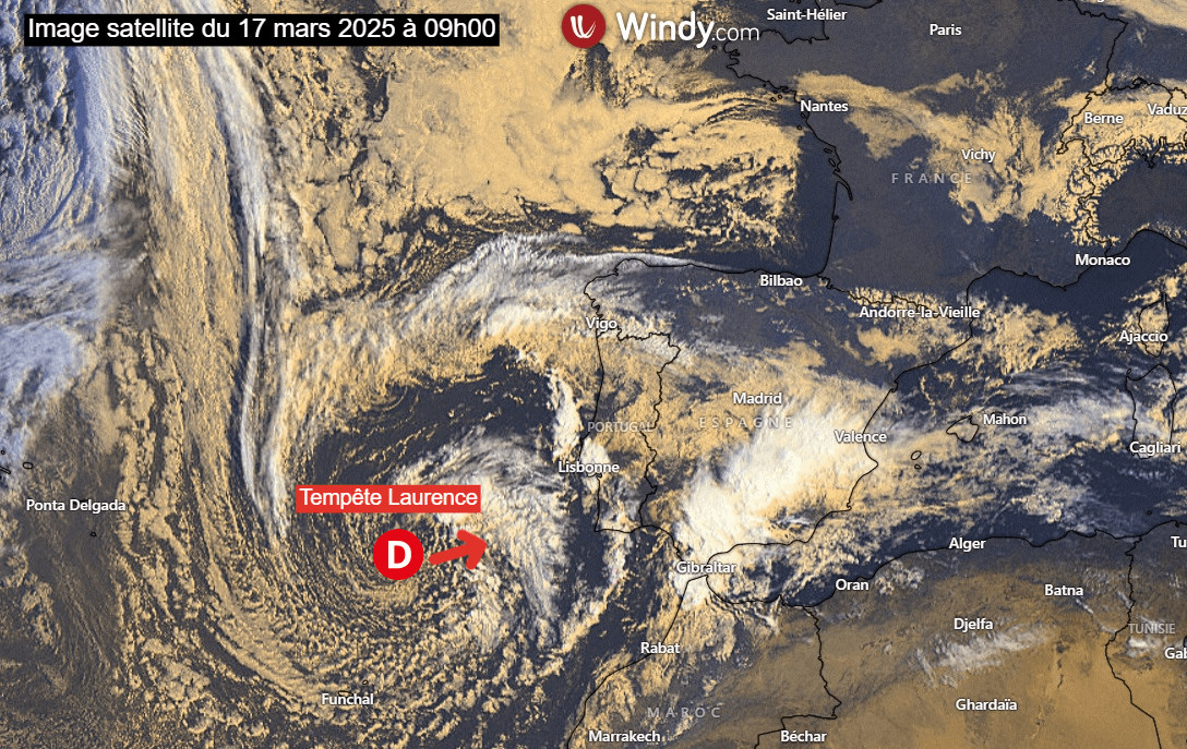 Image satellite du 17 mars 2025 montrant l'approche de la tempête Laurence – via Windy.com