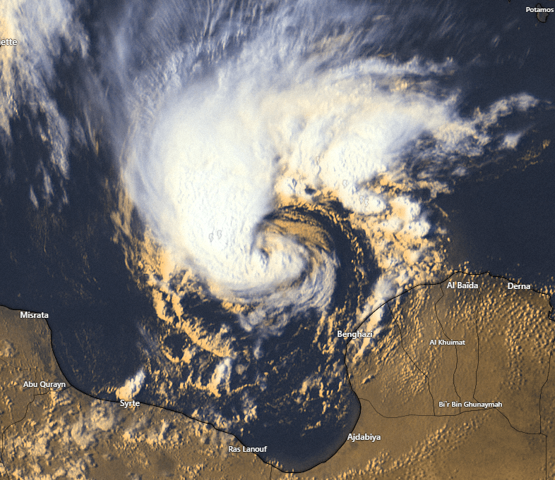 En quittant la Grèce par le sud, la dépression Daniel a fini par adopté des caractéristiques tropicales avec un cœur se réchauffant au dessus des eaux chaudes de la Méditerranée. Elle est alors devenue un medicane, une dépression possédant plusieurs caractéristiques communes avec les cyclones tropicaux. Ce medicane a fini par toucher terre en Libye dans la nuit du 9 au 10 septembre 2023, produisant des précipitations orageuses d'une rare violence.