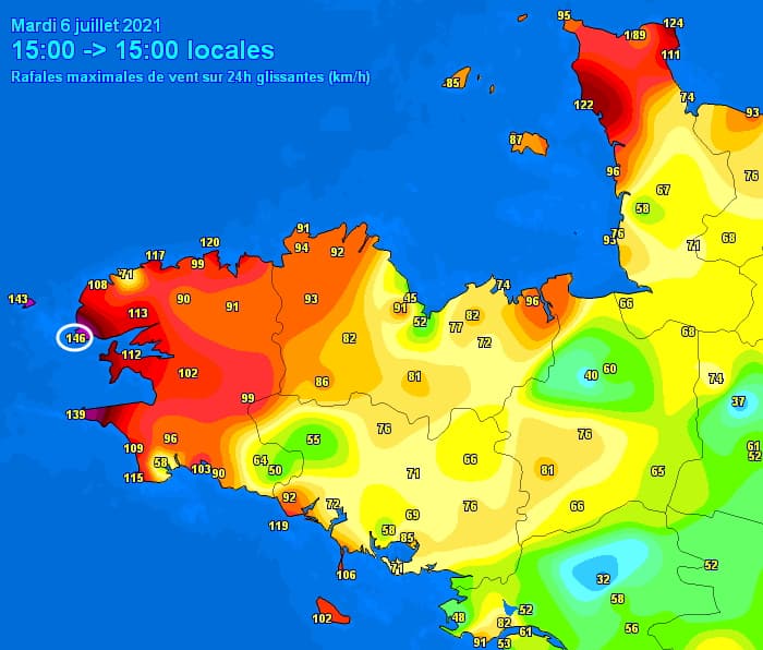 Les rafales ont été particulièrement fortes sur le Finistère au passage de la dépression. C'est à la Pointe Saint-Mathieu située à Plougonvelin que la valeur la plus élevée a été mesurée avec 146 km/h, pulvérisant l'ancien record de juillet (112 km/h le 29/07/2019) ! Ouessant suivait de près avec 143 km/h (record mensuel de 119 km/h début juillet 2004) ! À Brest, les vents ont atteint 113 km/h alors que les 100 km/h n'avaient jamais été atteints en juillet ! De même, la station de Landivisiau située dans les terres a mesuré 108 km/h alors que le record de juillet n'était que de 86 km/h !