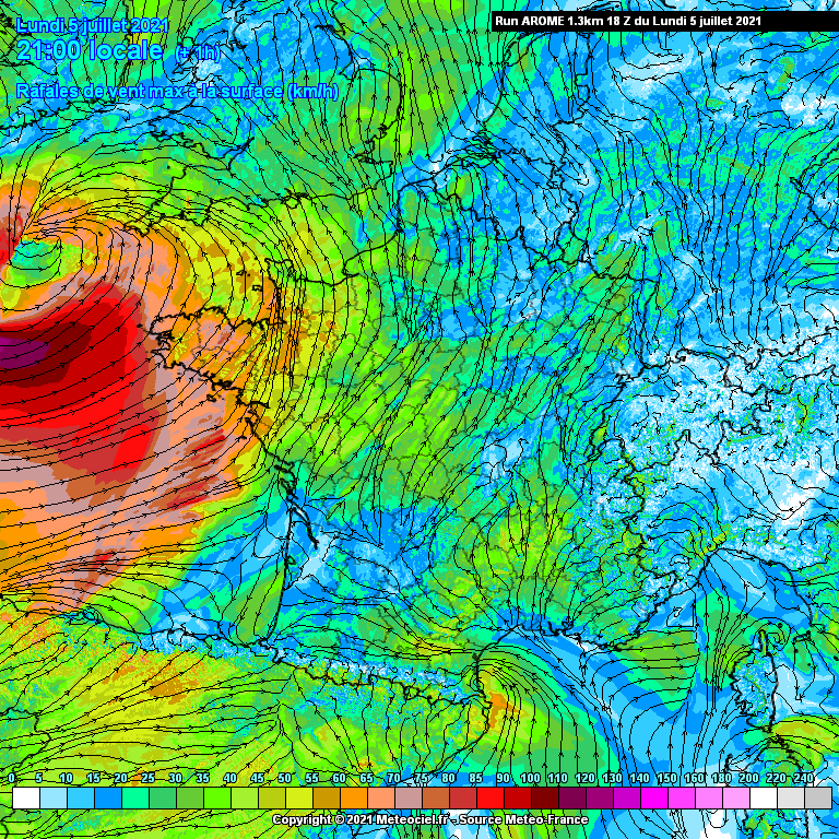 Modélisation des rafales du 5 juillet 2021 à 21h au 6 juillet 2021 à 16h - modèle AROME via meteociel.fr