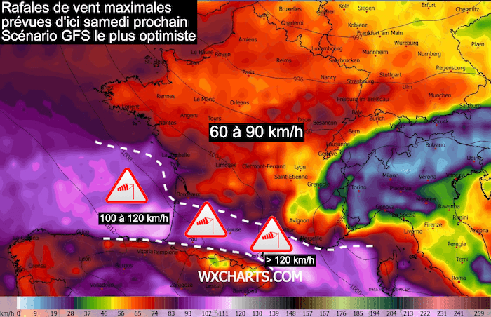 Vents maxi prévus d'ici le 23 février selon le scénario GFS (sans tempête explosive alors que le risque existe)