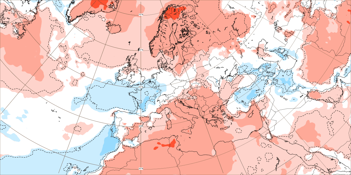 Ceci est visible d'une part par des anomalies froides persistantes sur les ¾ de la France et par des anomalies chaudes restant présentes près de la Méditerranée, laissant imaginer le même type de flux océanique que nous connaissons actuellement avec une large partie du pays concerné par de l'air océanique et les régions méditerranéennes restant privilégiées sous la chaleur et le soleil.