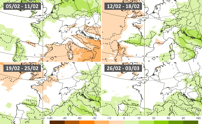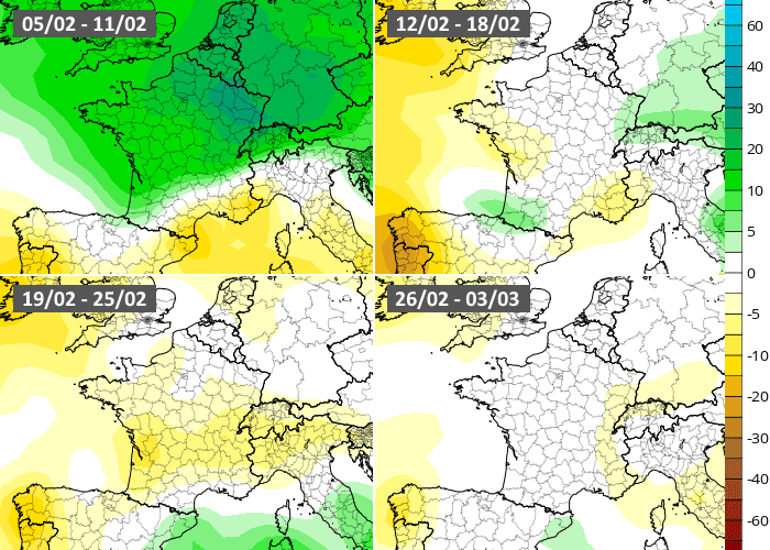 Anomalies pluviométriques hebdomadaires en février 2024 - modèle européen via ECMWF