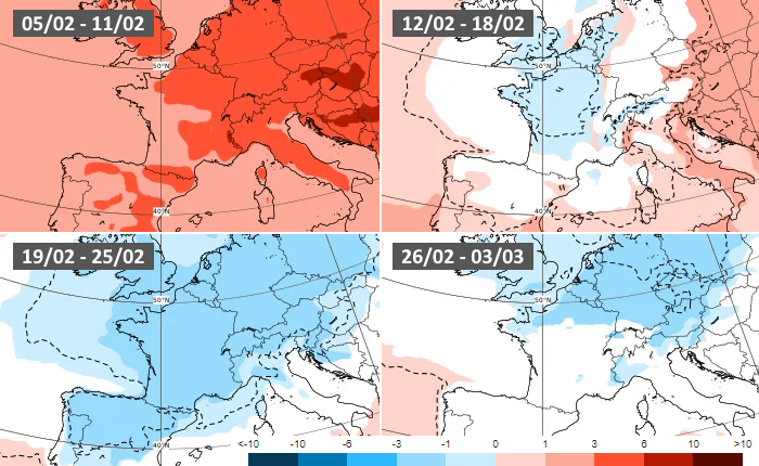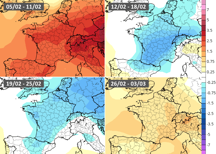 Si la douceur semble acquise pour l'ensemble de la première décade du mois, le modèle européen envisage un changement de programme en deuxième décade. Il projette des températures passant légèrement sous les normales dès la semaine du 12 au 18 février 2024 puis le froid pourrait dominer en se généralisant durant la semaine du 19 au 25 février. Cette masse d'air froid s'estomperait en reculant vers le nord en fin de mois. Autrement dit, l'hiver pourrait signer son retour dès la deuxième décade de février avec des températures repassant sous les normales.