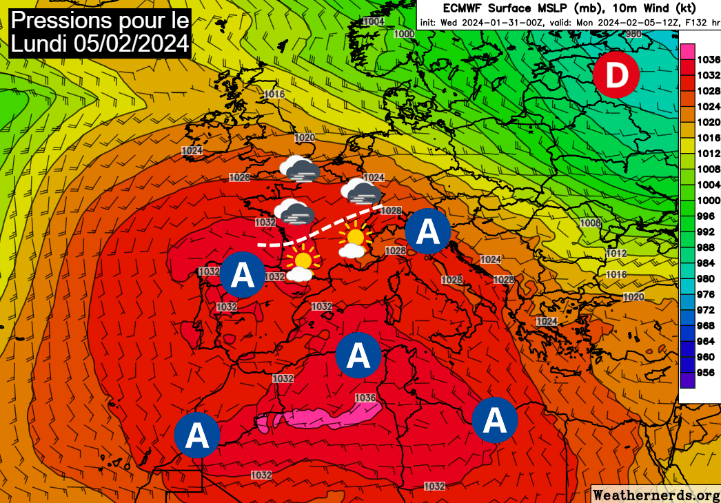 Modélisation des pressions pour le lundi 5 février 2024 - via weathernerds.org