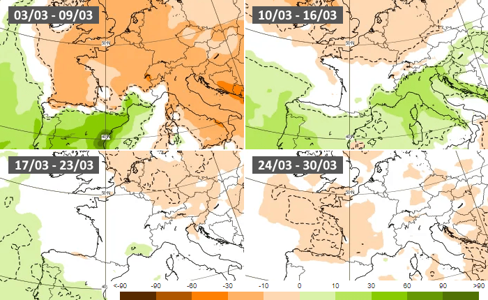 Anomalies pluviométriques hebdomadaires au mois de mars 2025 - modèle européen via ECMWF