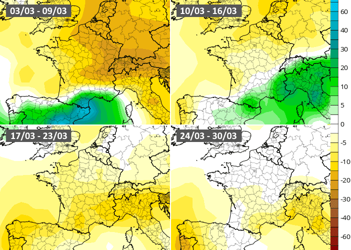 Le modèle européen confirme que cette semaine du 3 au 9 mars 2025 sera très sèche, en dehors d'averses vers les Pyrénées, le golfe du Lion et les Cévennes (en marge d'un temps agité sur l'Espagne). Puis, l'instabilité reviendrait en semaine du 10 au 16 mars, notamment en Méditerranée où des pluies assez copieuses sont envisagées. La troisième et la quatrième semaines du mois seraient plus classiques, bien qu'une fin de mois sèche est envisagée.