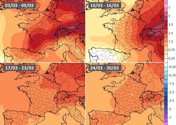 Anomalies thermiques hebdomadaires au mois de mars 2025 - modèle européen via ECMWF