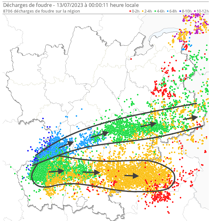 Activité électrique sur Rhône-Alpes en fin de journée du mercredi 12 juillet 2023 - carte keraunos.org