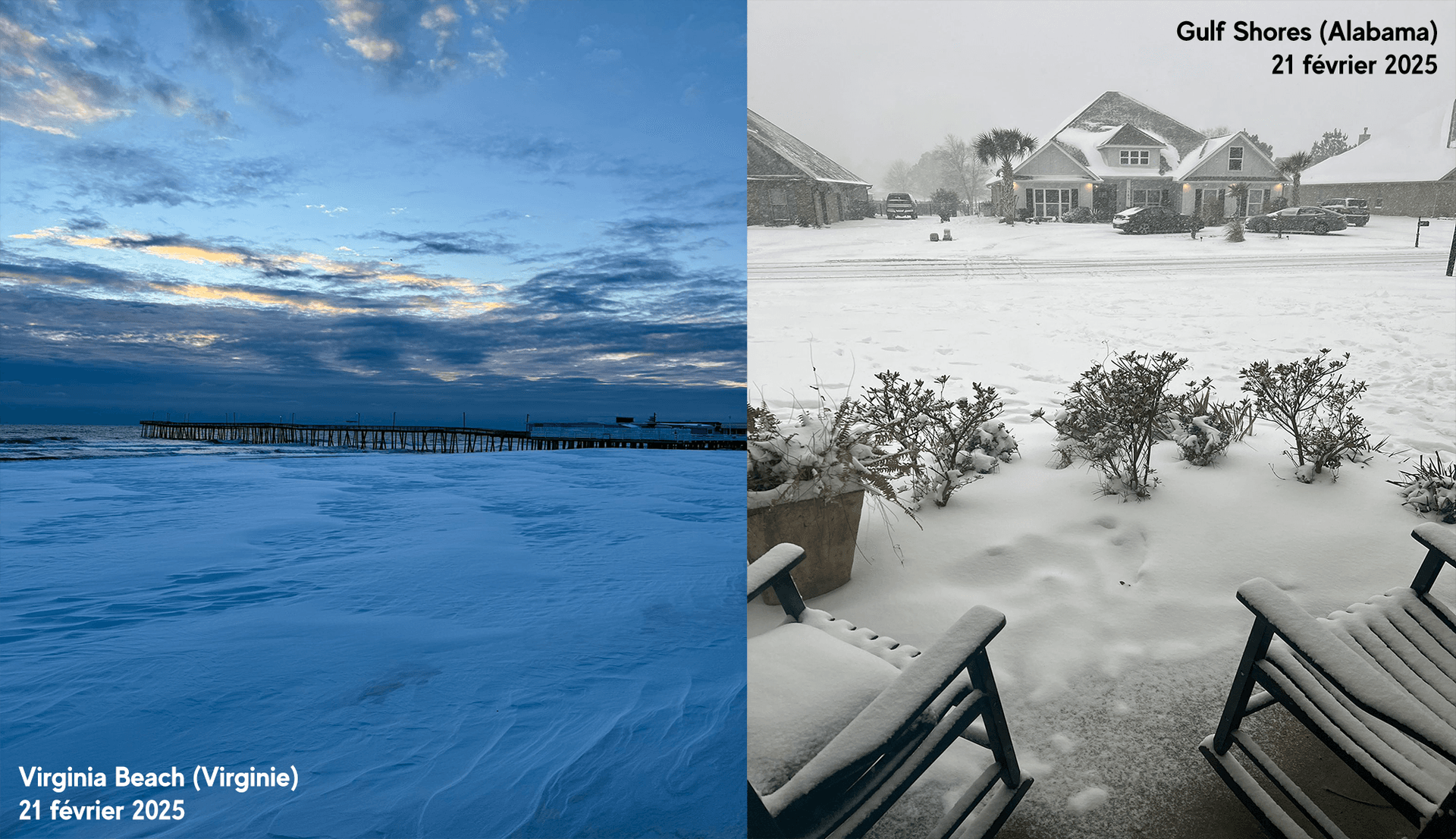 Chutes de neige à Virginia Beach (Virginie) et à Gulf Shores (Alabama) - 21 février 2025 - Twitter @IanOliverWX et @AsphaltCowb0y
