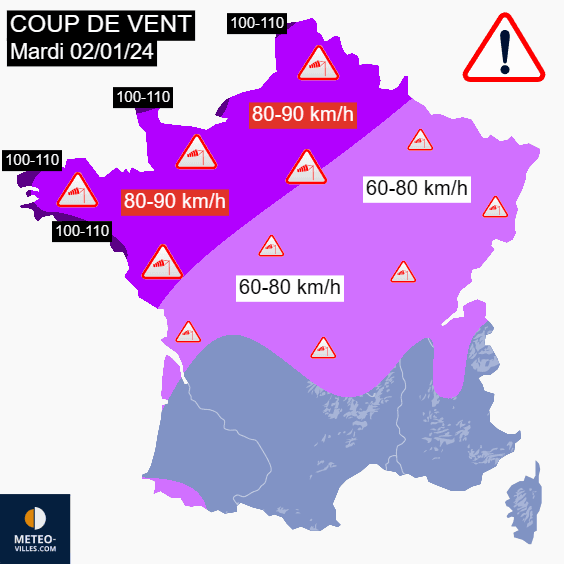 Outre les fortes pluies, il faudra également s'attendre à un vent très fort sur une large moitié nord de la France. Ce dernier soufflera tout au long de la journée du mardi 2 janvier 2024 avec un pic d'intensité dès la fin de matinée sur la Bretagne puis un après-midi sur un large quart nord-ouest et en soirée sur l'extrême nord et le nord-est du territoire. Des rafales de 80 à 90 km/h sont prévues dans les terres de la Bretagne et des Pays de la Loire jusqu'aux Hauts-de-France, jusque 100 à 110 km/h le long des côtes. Du centre au nord-est de la France, les bourrasques atteindront généralement 60 à 80 km/h.
