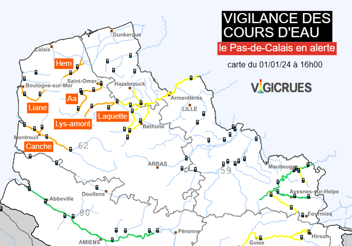 Carte de vigilance des cours d'eau dans le Nord-Pas-de-Calais au 1er janvier à 16h - Vigicrues