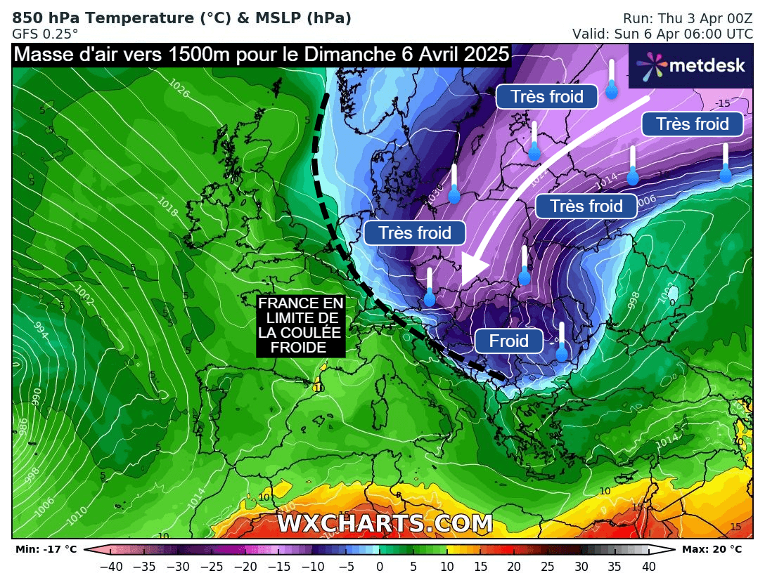 Si nous allons vivre un pic de douceur en fin de semaine, les températures devraient fléchir par les frontières du nord dès ce dimanche 6 avril 2025. La faute à une imposante coulée d'air froid qui plongera sur l'Europe Centrale puis les Balkans. Vers 1500 mètres d'altitude, la température de la masse d'air atteindra les -10°C dans l'est de l'Allemagne et -13°C en Pologne, des niveaux très bas pour un mois d'avril ! La France va rester en bordure de cette coulée froide, qui plongera vers le sud en longeant nos frontières orientales.
