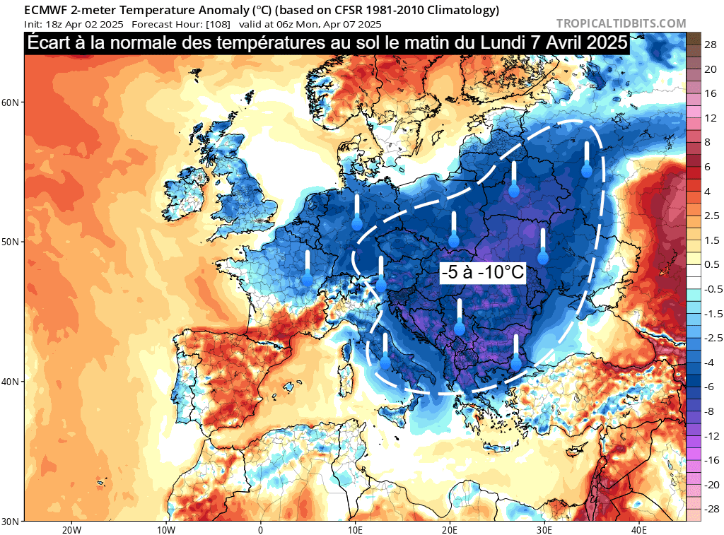 Écart à la normale des températures au sol le matin du lundi 7 avril 2025 - tropicaltidbits.com