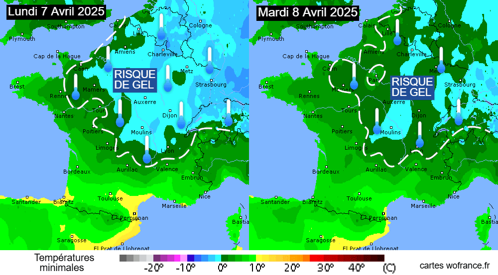 Températures minimales modélisées pour les lundi 7 et mardi 8 avril 2025 - wxcharts.com