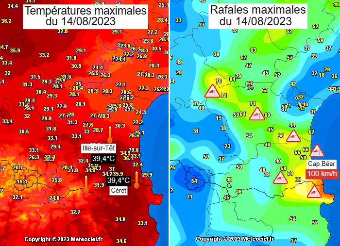 Températures maximales et rafales de vent dans les Pyrénées-Orientales le lundi 14 août 2023 - via meteociel.fr