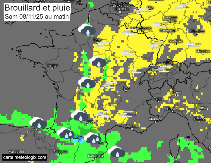 Risque de brouillard (en jaune) et de pluie (en vert) le matin du samedi 8 novembre 2025 - meteologix.com
