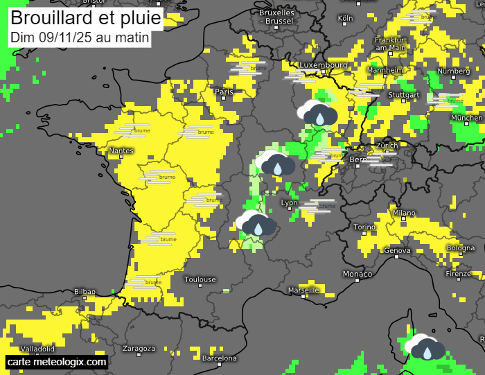 Risque de brouillard (en jaune) et de pluie (en vert) le matin du dimanche 9 novembre 2025 - meteologix.com
