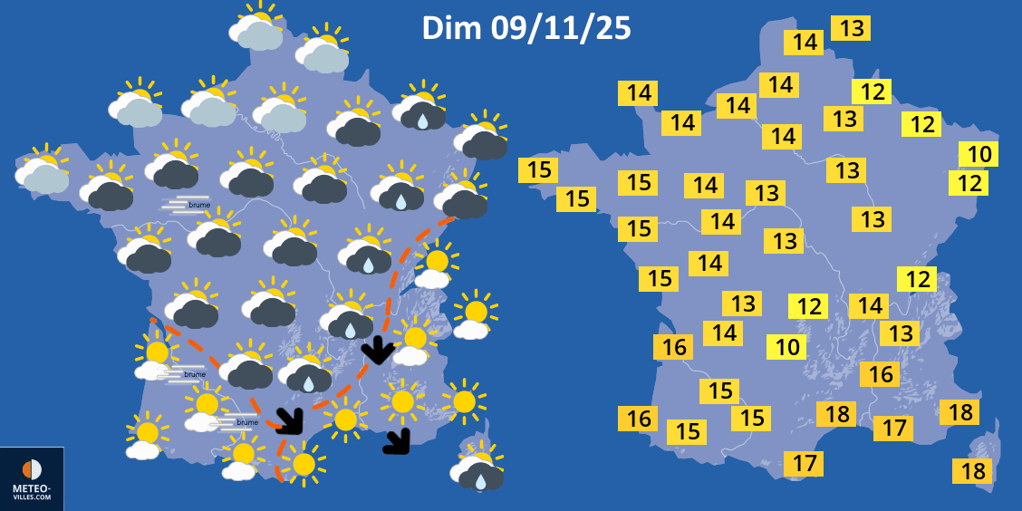 Le temps de la journée de dimanche 9 novembre 2025 va rester nébuleuse dans plus des deux tiers de la France. La grisaille distillera même quelques bruines ou pluies fines du Massif Central à la Lorraine. En revanche, de belles éclaircies se développeront au sud de la Garonne en après-midi et le soleil sera généreux des Alpes au bassin méditerranée, sauf en Corse où une ondée sera encore possible. Les températures maximales vont légèrement fléchir, s'établissant le plus souvent entre 12 et 15°C. Il fera plus doux en Méditerranée avec 17 ou 18°C.