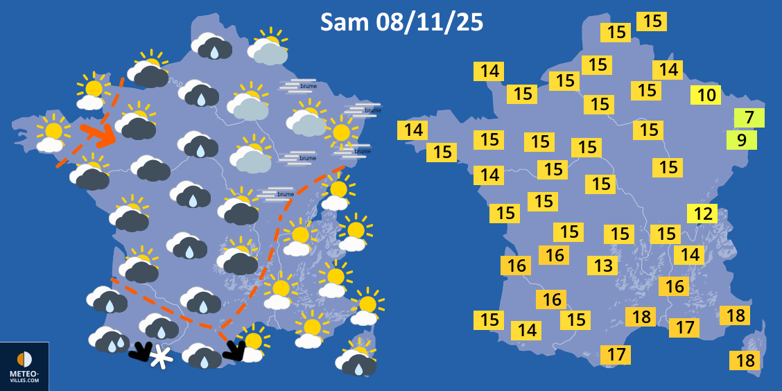 Prévisions météo et températures maximales pour le samedi 8 novembre 2025 - Météo Villes