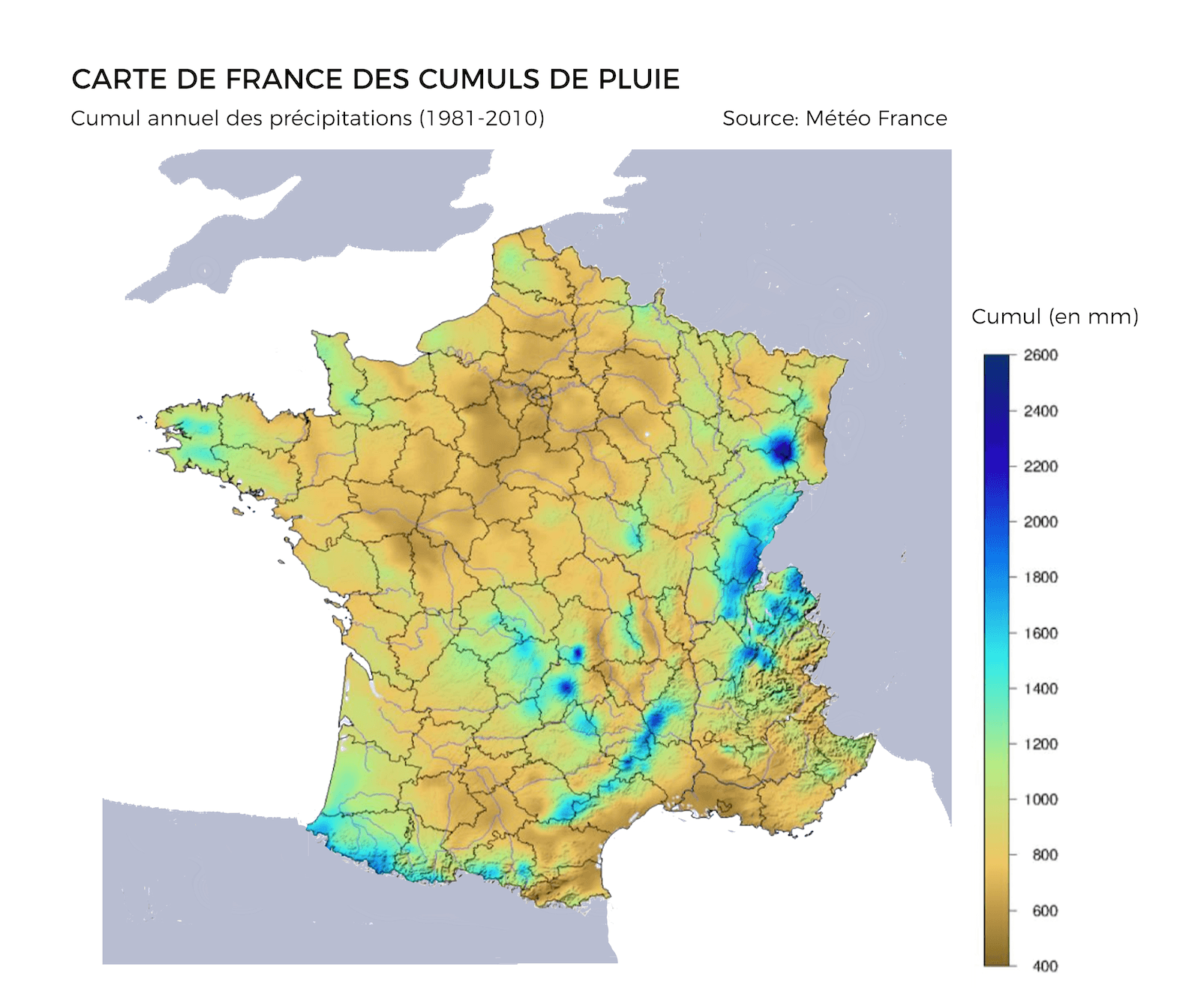 Cumul annuel moyen de pluie en France sur la période 1981-2010 - Météo-France