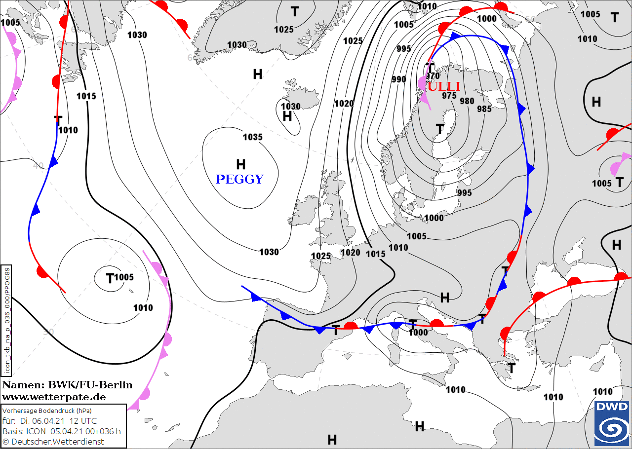 Noms des dépressions et anticyclones prévus pour mardi 6 avril 2021 à midi (Berlin)