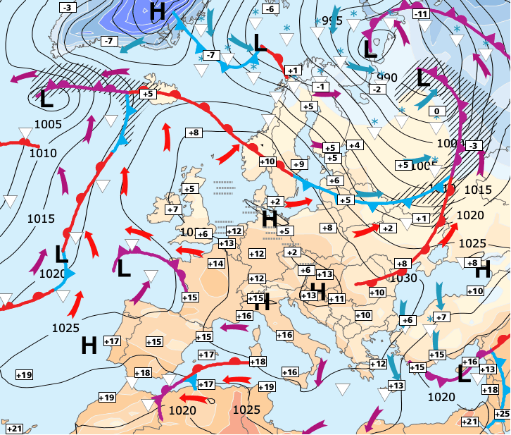 + L'anticyclone se décale vers l'Europe centrale, permettant des remontées d'air plus chaud mais de nouveau chargées de poussière du Sahara (pour la 3e fois en 1 mois !!).