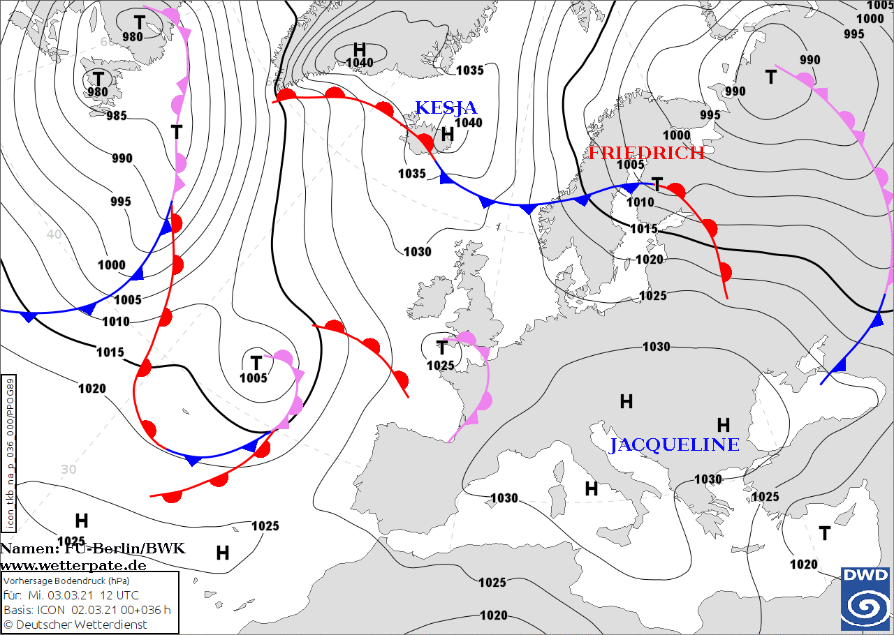 Noms des dépressions et anticyclones prévus pour mercredi 3 mars 2021 à midi (Berlin)