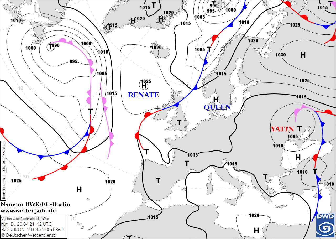Noms des dépressions et anticyclones prévus pour mardi 20 avril 2021 à midi (Berlin)