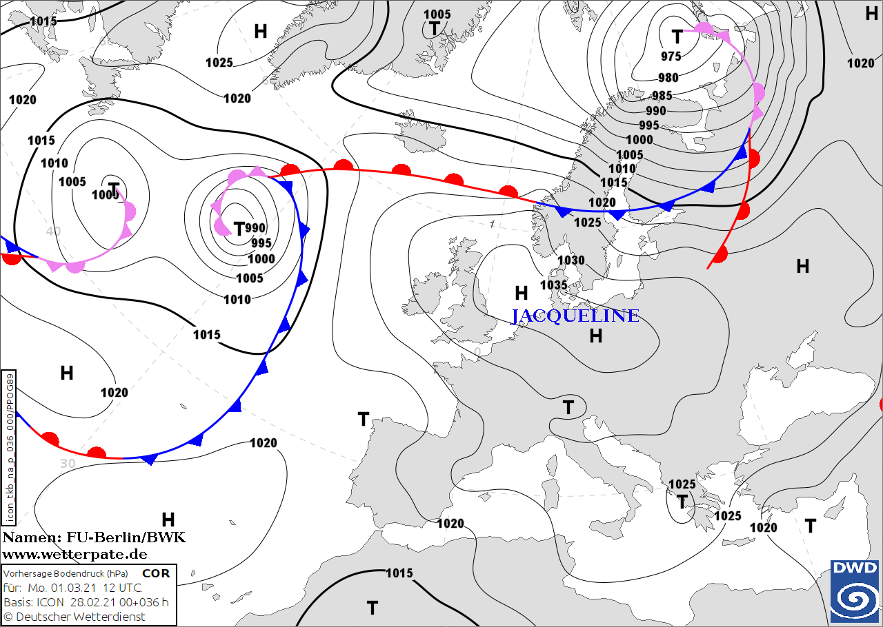 Noms des dépressions et anticyclones prévus pour lundi 1er mars 2021 à midi (Berlin)