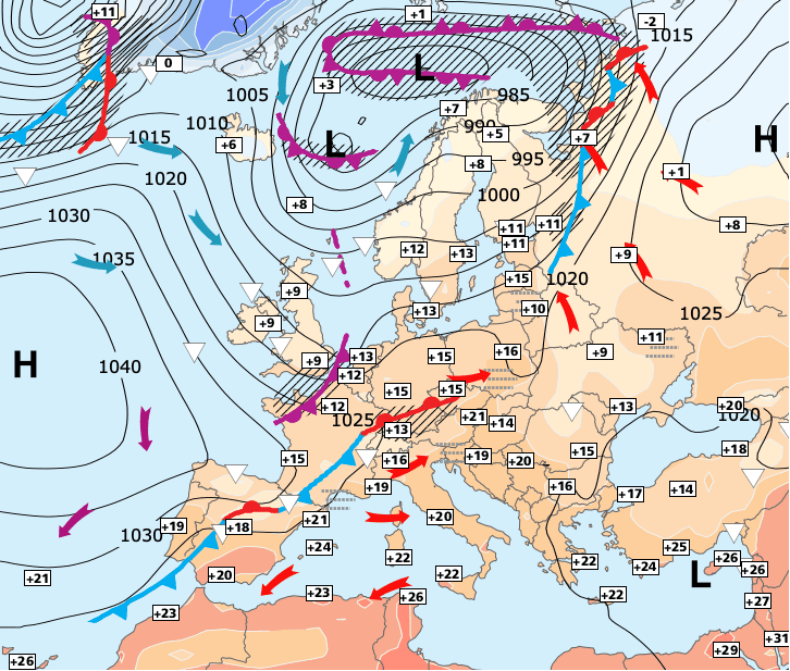 + L'air plus froid venu d'Islande a fait baisser les températures de manière spectaculaire (jusqu'à 14°C de moins en 24h vers Auvergne >>).