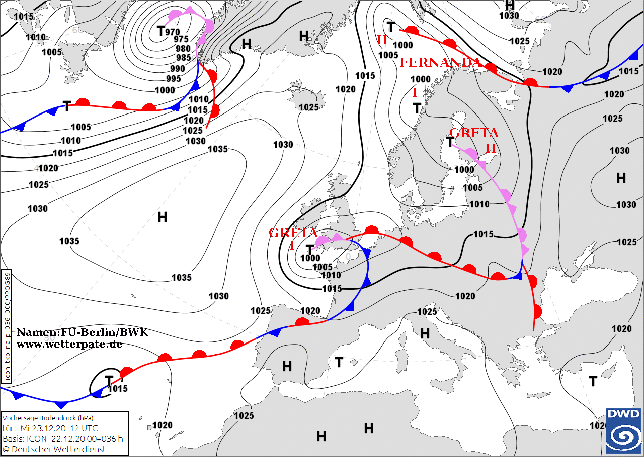 Noms des dépressions et anticyclones prévus pour jeudi 24 décembre 2020 à midi (Berlin)
